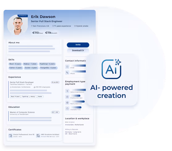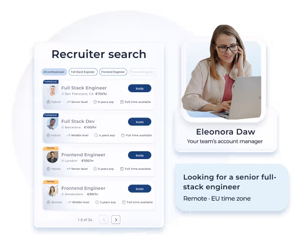 Access our curated database of high-skilled professionals, with AI matching and expert recruiters to support you. From first match to first day, all in one solution.