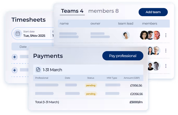 Manage contracts, timesheets, invoicing, payments, and expenses in one environment with back-office admin support included.