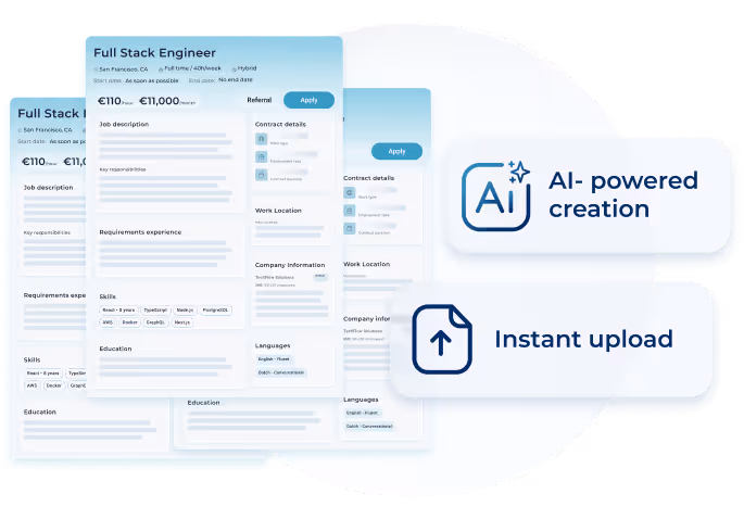 AI-powered profile improvements in seconds. Enter details or upload existing vacancies.